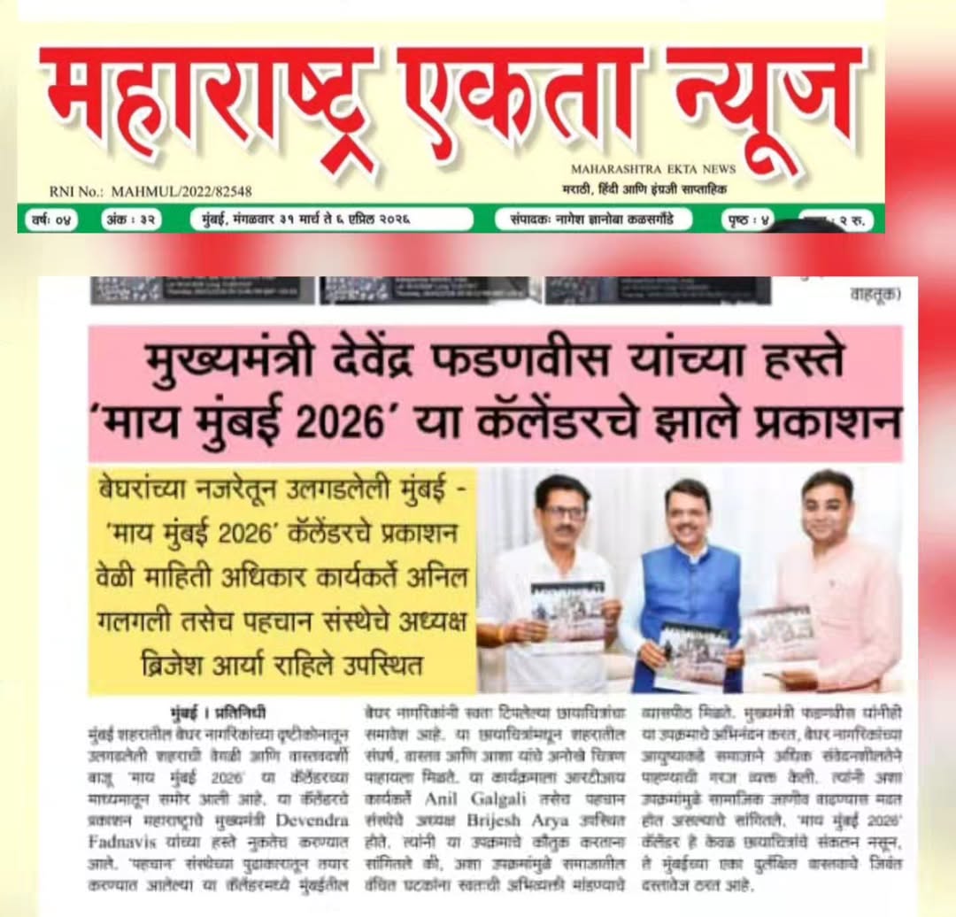 महाराष्ट्र एकता न्यूज पहचान तर्फे मुंबईतील बेघर नागरिकांनी त्यांच्या नजरेतून टिपलेल्या छायाचित्रांवर आधारित “माय मुंबई 2026” या कॅलेंडरचे प्रकाशन महाराष्ट्र राज्याचे मुख्यमंत्री देवेंद्र फडणवीस यांच्या हस्ते करण्यात आले. या प्रसंगी आरटीआय कार्यकर्ते अनिल गलगली तसेच बृजेश आर्य उपस्थित होते.