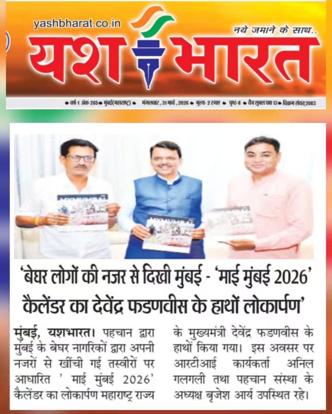 यश भारत- पहचान द्वारा मुंबई के बेघर नागरिकों द्वारा अपनी नजरों से खींची गई तस्वीरों पर आधारित “ माई मुंबई 2026” कैलेंडर का लोकार्पण महाराष्ट्र राज्य के मुख्यमंत्री देवेंद्र फडणवीस के हाथों किया गया। इस अवसर पर आरटीआई कार्यकर्ता अनिल गलगली तथा अध्यक्ष बृजेश आर्य उपस्थित थे #Mumbai2026 #fujifilm #thanksdevabhau #HomelessVoices fujiflimprint pehchanfoundation HindiNews thanks Anil Galgali Pehchan Foundation brijesharya