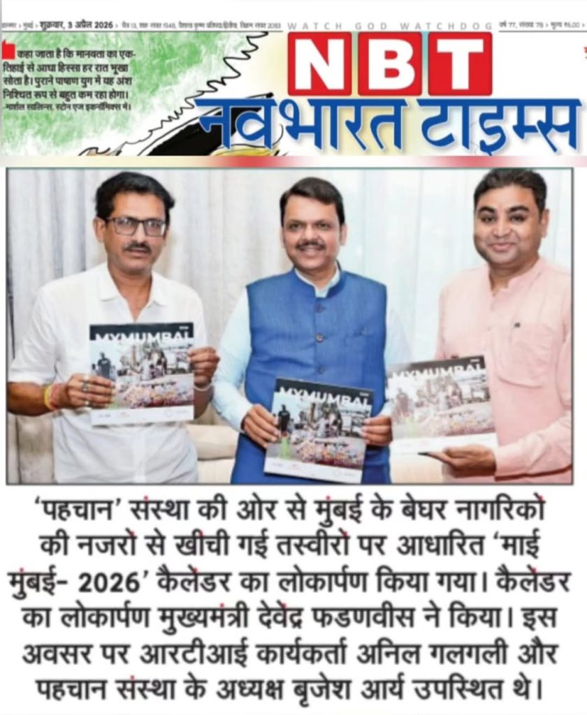 नवभारत टाइम्स- पहचान संस्था की ओर से मुंबई के बेघर नागरिकों की नजरों से खींची गई तस्वीरों पर आधारित “ माई मुंबई 2026” कैलेंडर का लोकार्पण किया गया। कॅलेंडर का लोकार्पण महाराष्ट्र राज्य के मुख्यमंत्री देवेंद्र फडणवीस ने किया। इस अवसर पर आरटीआई कार्यकर्ता अनिल गलगली तथा पहचान संस्था के अध्यक्ष बृजेश आर्य उपस्थित थे।