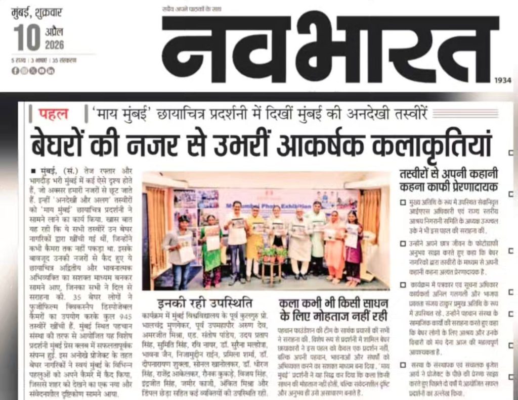 नवभारत- हिंदी न्यूजपेपर | ‘माय मुंबई’ छायाचित्र प्रदर्शनी में दिखीं मुंबई की अ… Leave a Comment / News / By admin नवभारत- हिंदी न्यूजपेपर | ‘माय मुंबई’ छायाचित्र प्रदर्शनी में दिखीं मुंबई की अनदेखी तस्वीरें बेघरों की नजर से उभरीं आकर्षक कलाकृतियां #mymumbaiphotoexhibition #Pehchan #HomelessVoices #HindiNews #mymumbai fujifilm [