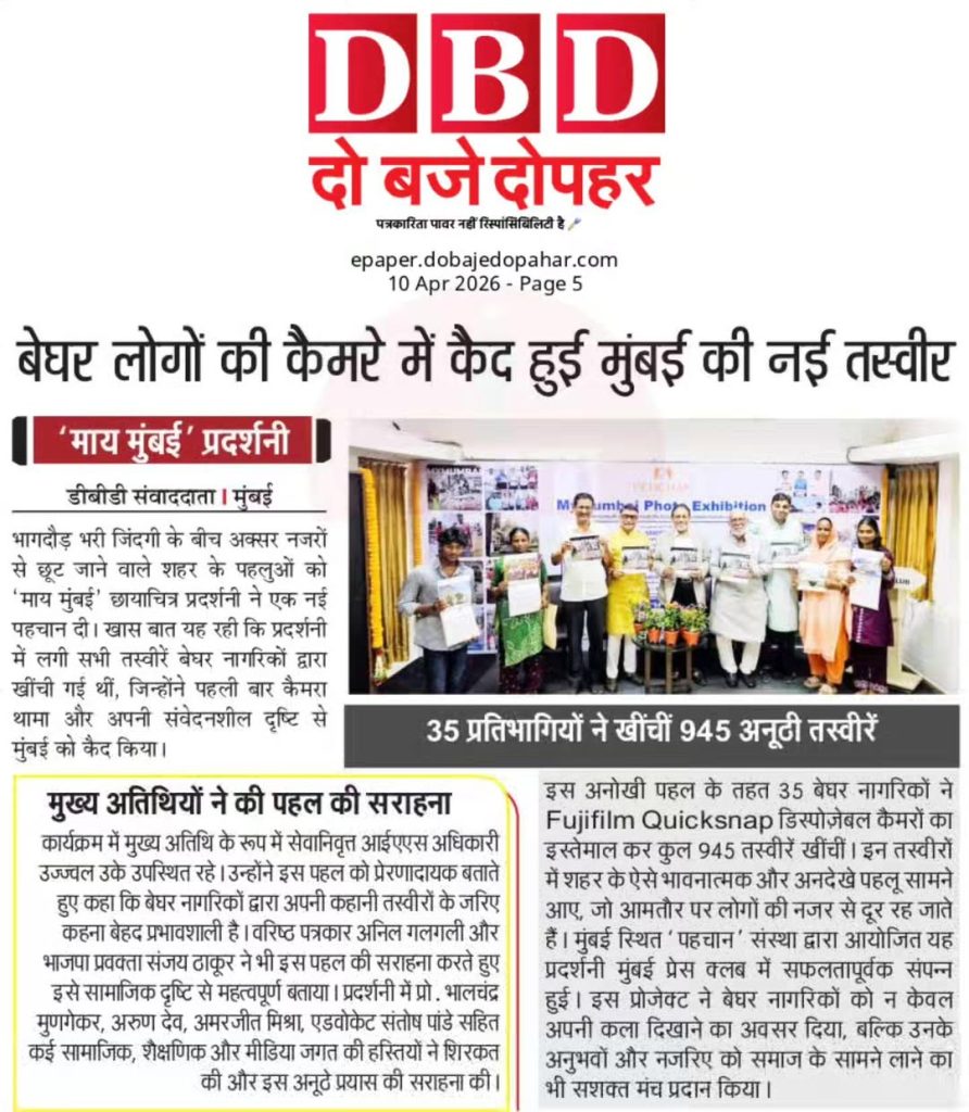 भागदौड़ भरी जिंदगी के बीच अक्सर नजरों से छूट जाने वाले शहर के पहलुओं को माय मंबईं” छायाचित्र प्रदर्शनी ने एक नई पहचान दी। खास बात यह रही कि प्रदर्शनी में लगी सभी तस्वीरें बेघर नागरिकों द्वारा खींची गई थीं. जिन्होंने पहली बार कैमरा थामा और अपनी संवेदनशील दृष्टि से मुंबईं को कैद किया DBD 10 Apr 2026- Page 5