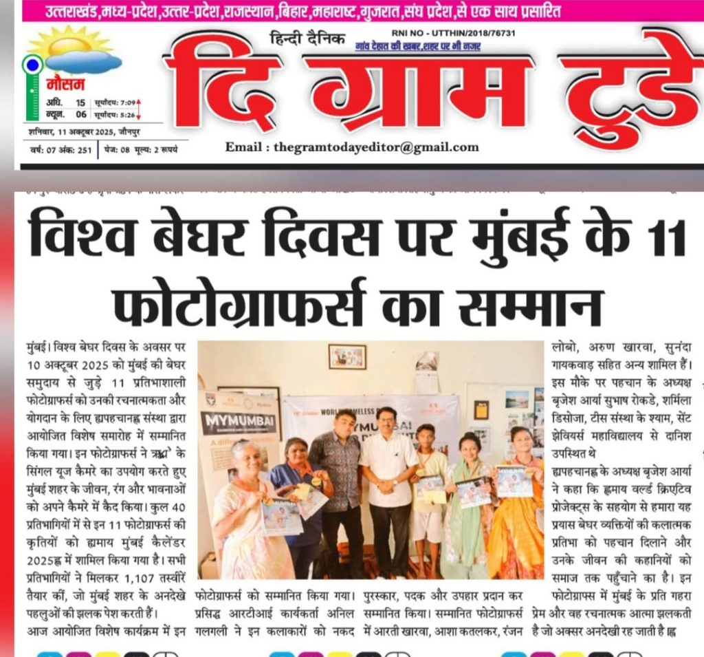 Pehchan Spotlights Homeless Photographers on World Homeless Day Mumbai, India – October 10, 2025 Today, on #WorldHomelessDay eleven photographers from Mumbai’s homeless community were honoured for their work and creativity featured in the ‘My Mumbai Calendar 2025.’ The project, led and initiated by Pehchan, celebrates their creativity and unique perspectives on the city of Mumbai.