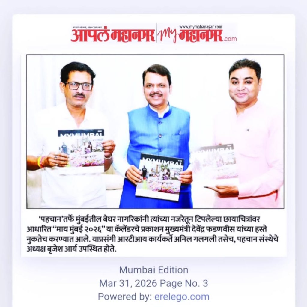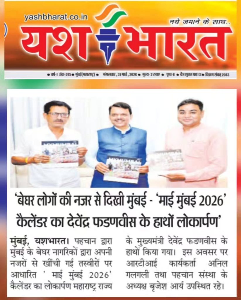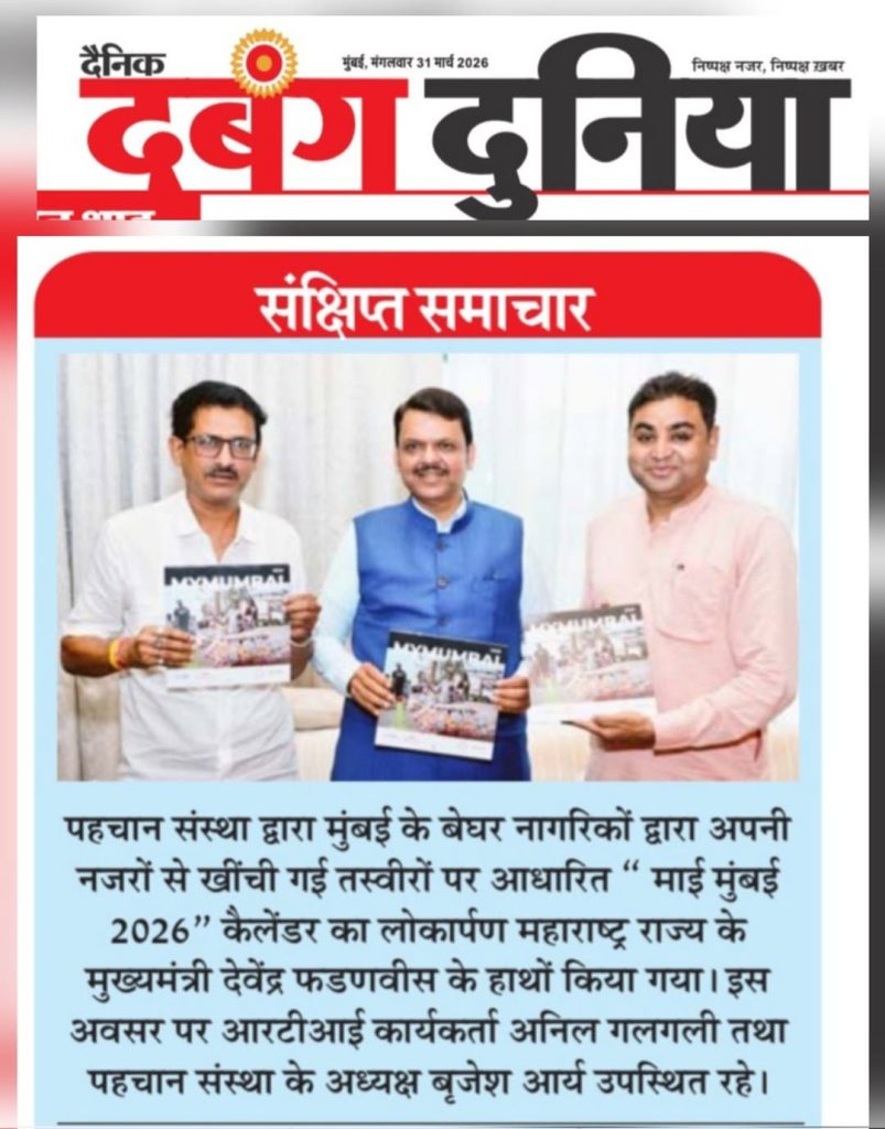 दबंग दुनिया – पहचान द्वारा मुंबई के बेघर नागरिकों द्वारा अपनी नजरों से खींची गई तस्वीरों पर आधारित “ माई मुंबई 2026” कैलेंडर का लोकार्पण महाराष्ट्र राज्य के मुख्यमंत्री देवेंद्र फडणवीस के हाथों किया गया। इस अवसर पर आरटीआई कार्यकर्ता अनिल गलगली तथा अध्यक्ष बृजेश आर्य उपस्थित रहे। #Pehchan #mymumbai2026 #disposablescamera #thanksdevabhau #HomelessVoices fujiflimprint pehchanfoundation […]